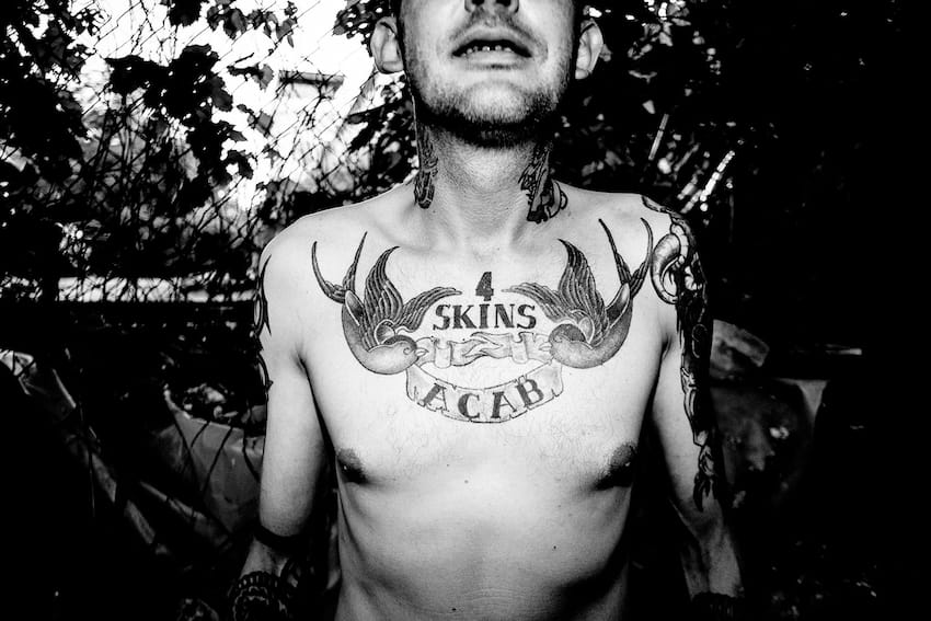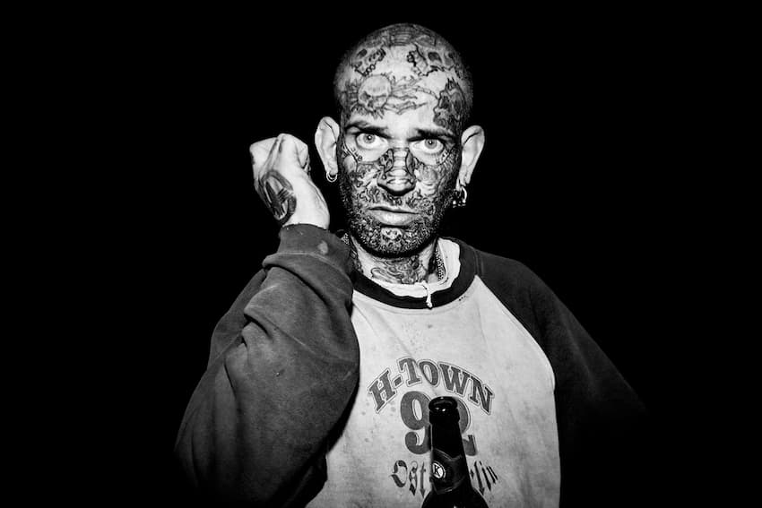 À l’intérieur, des baffles énormes crachent un gros son. Tout le monde est défoncé. Grosse soirée débranchée. Je repère ce gars avec des tatouages partout. Je n’ai qu’une envie, faire son portrait, alors je fonce sur lui.